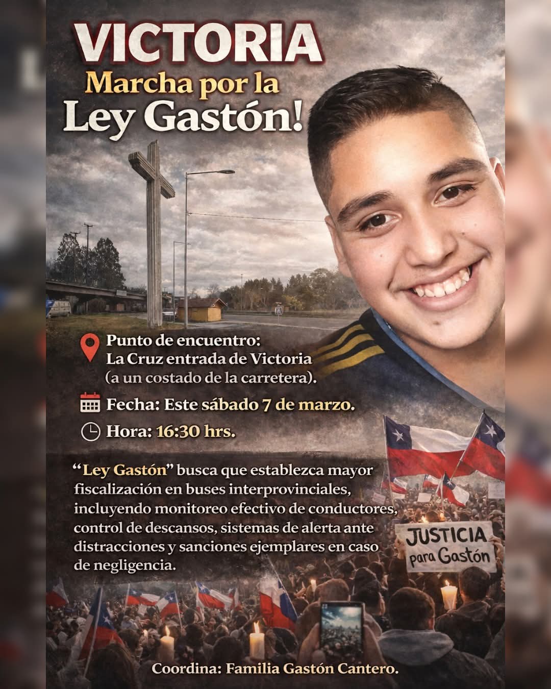 A un mes del trágico accidente ocurrido en la Ruta 5 sur, a la altura de Pitrufquén, la familia de Gastón Cantero Valenzuela, joven de 19 años que se desempeñaba como auxiliar en la empresa Turbus, inició una campaña para promover una nueva normativa que refuerce la seguridad en el transporte inter regional. La iniciativa, denominada “Ley Gastón”, busca establecer mayores controles, fiscalización efectiva y sanciones ejemplares para prevenir nuevas tragedias.